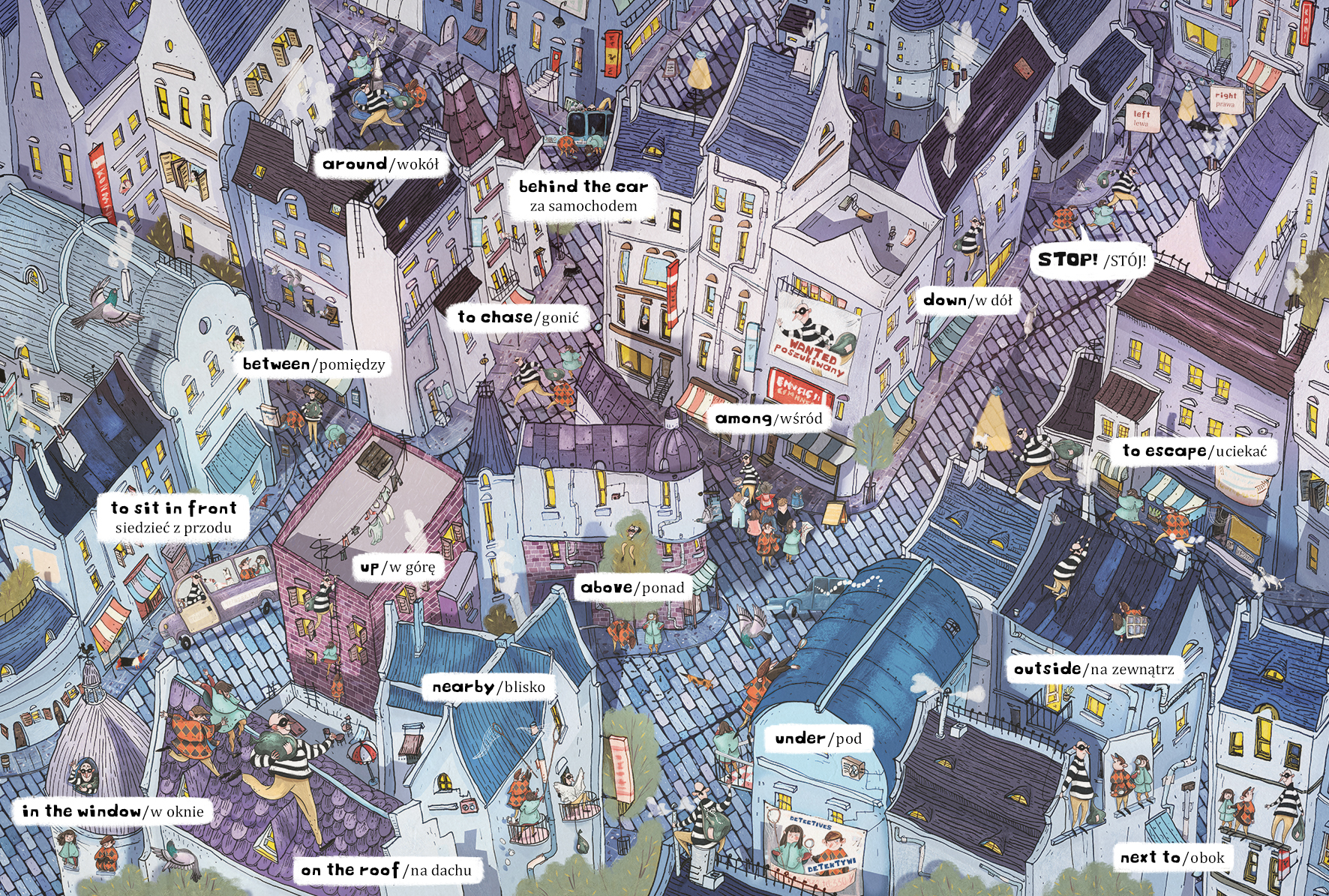 On the trail of English words presents 12 richly illustrated spreads on which English words, phrases and simple sentences appear on the basis of associations.